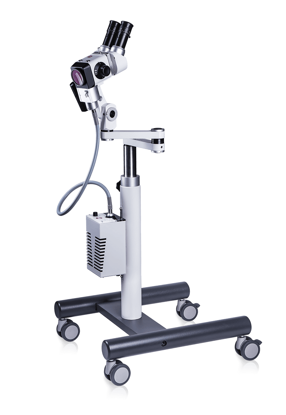 Die Schwenk- und Schwebearm-Kombination ermöglicht millimetergenaue Positionierung. Bei Nichtgebrauch schwenkt das Kolposkop platzsparend zur Seite. Kompatibel mit allen gängigen Untersuchungsstühlen, Montage rechts oder links möglich.